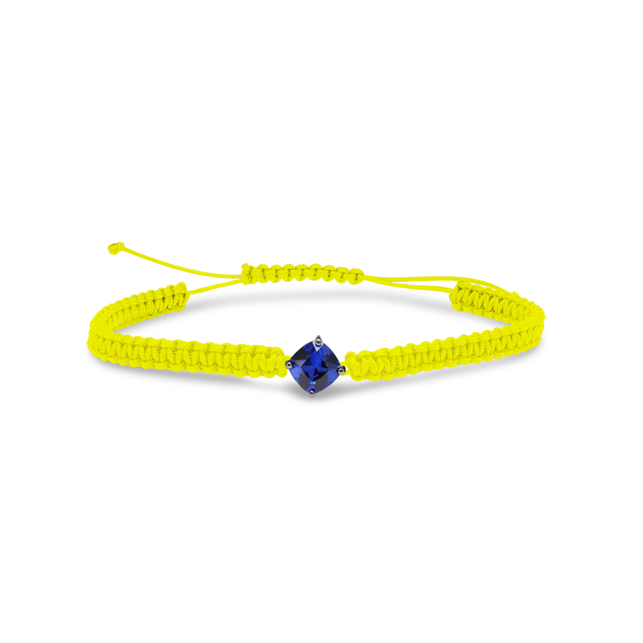 Our sapphire bracelet features a handwoven nylon band, known for its durability and vibrant color. At its center, a delicate tilted cushion cut sapphire adds a touch of elegance. The adjustable design ensures a comfortable fit, making it a perfect accessory for everyday wear or special occasions.